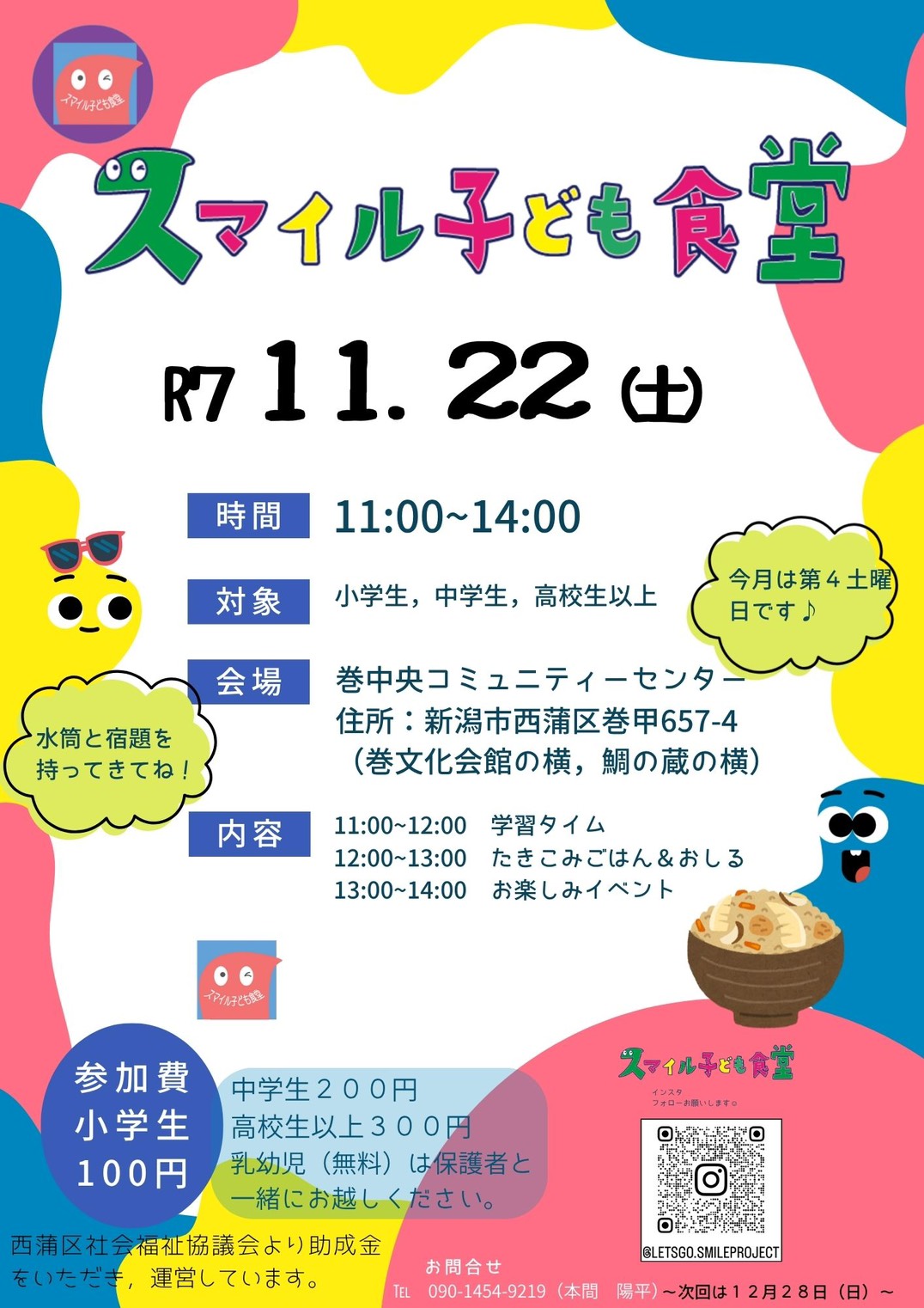 - スマイル子ども食堂秋も楽しいこと、美味しいものが盛りだくさん!初めての方も大歓迎です✨ 10月18日(土)のスマイル子ども食堂今月は第3土曜日に開催します🙌• 日時: 10月18日(土)11:00~14:00• 場所: 巻中央コミュニティ […]