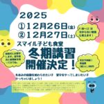 - スマイル子ども食堂 冬期講習開催!冬休みの宿題と書き初め、一緒に終わらせませんか? スマイル子ども食堂より、冬休みの学習イベントのお知らせです。 「家で習字をすると汚れて大変…」「年末は忙しくて宿題を見てあげられない」 そんなお悩みをお持ちの保護者の皆様 […]